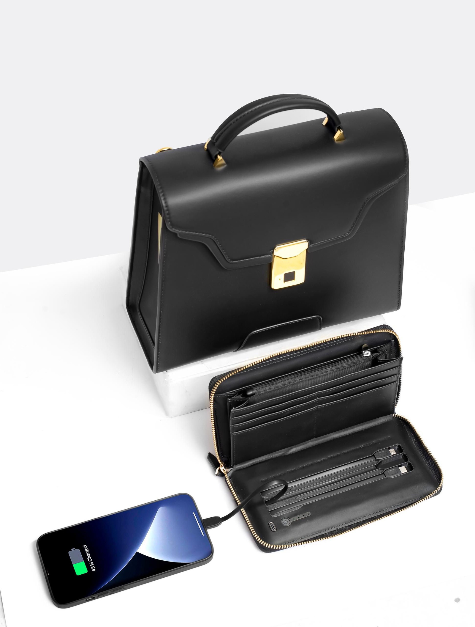 High quality water, stain and scratch-proof leather. Ample storage space. Rechargeable and programmable fingerprint lock. Rechargeable wallet with built in 5,000 mah battery. Compatible with both iOS and android devices.