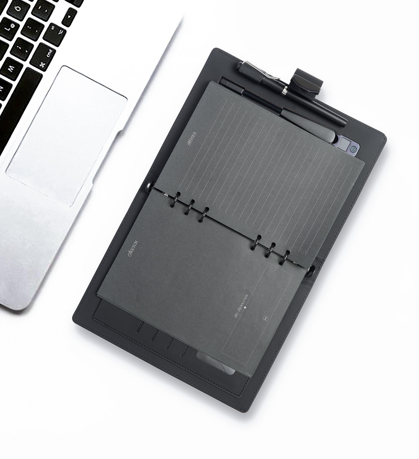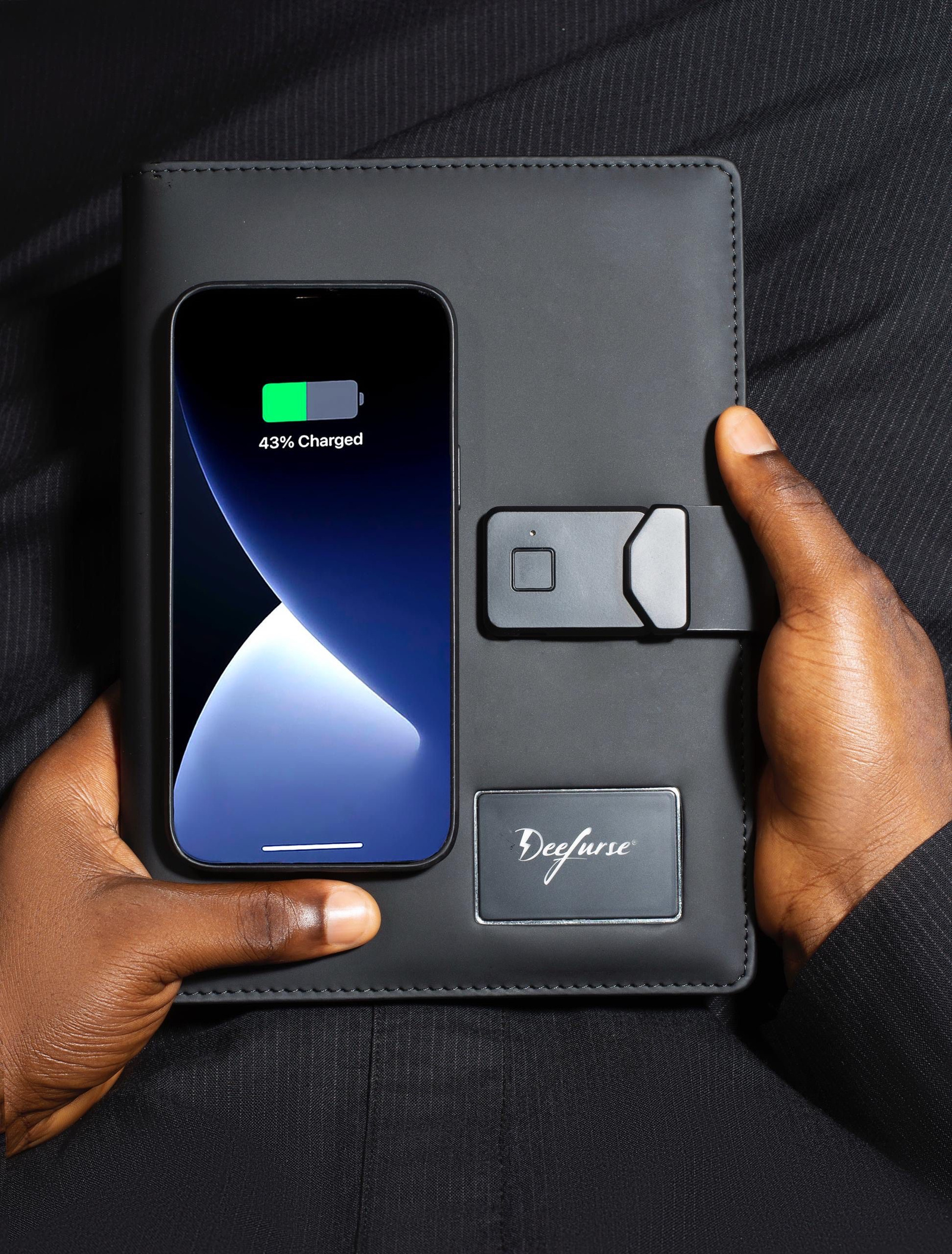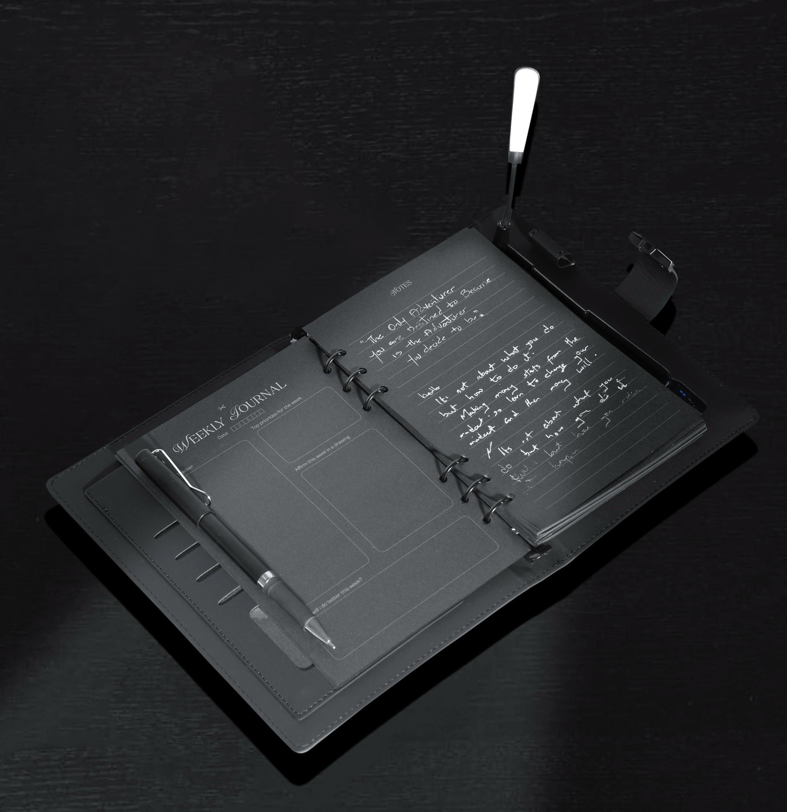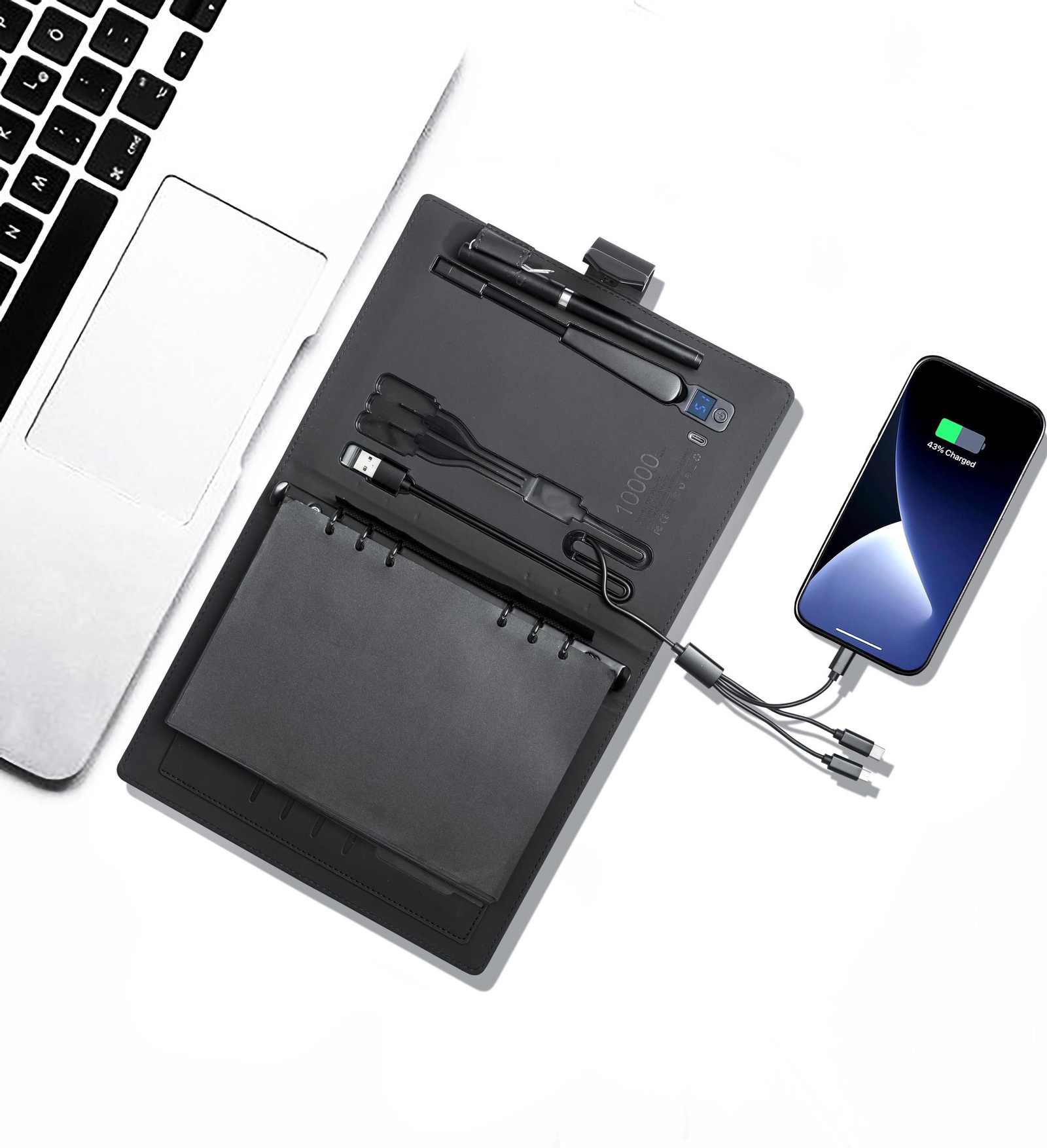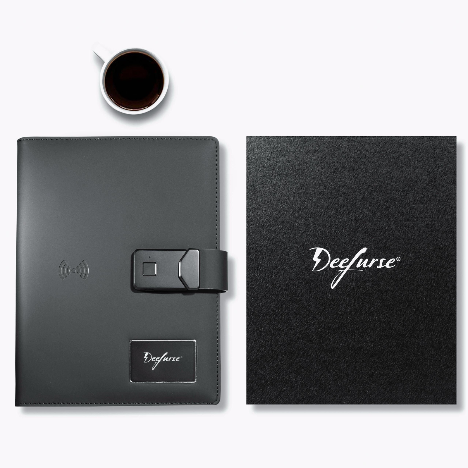 Features: Rechargeable Biometric Lock. 10,000 mAh built in battery. Cable and wireless charging. iOS and Android compatible. 160 black sheets. Silver ink pen. 15GB flash drive. Card sleeves. Reading lamp.